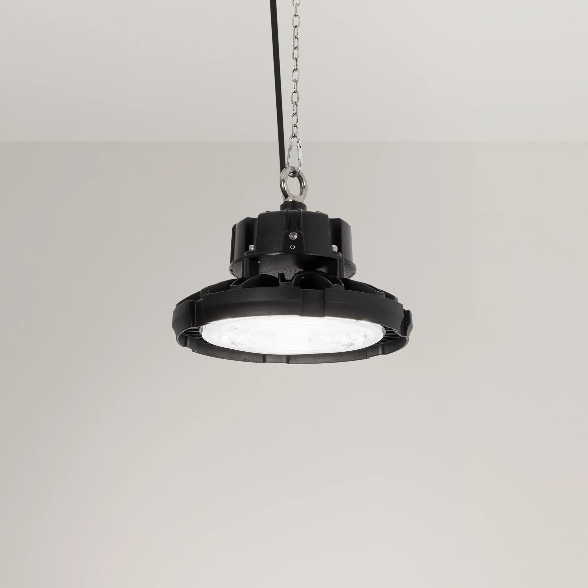 Поставка под заказ от 200 шт. Светильник для освещения складских и промышленных помещений. Мощность 100W, напряжение питания AC 220-240V/50Hz. CRI 80. Тип светодиодов SMD2835, с групповой оптической линзой. Цвет свечения ДНЕВНОЙ 5000K, световой поток 14000 Lm, угол рассеивания 120°. Цвет корпуса черный, линза из поликарбоната, степень влагозащиты IP65. Габариты Ф245xH188мм. Рым-болт в комплекте.