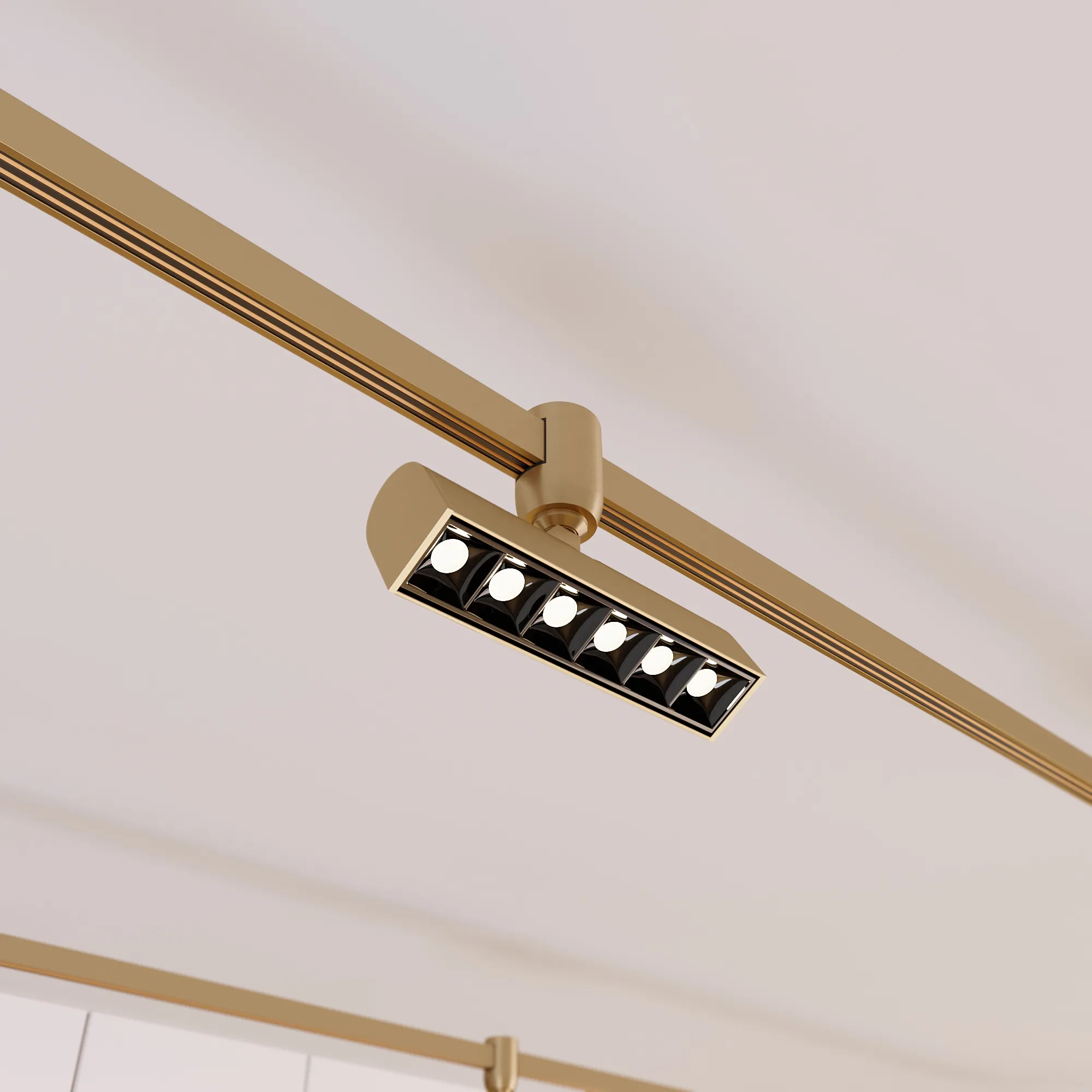 Светильник поворотный для треков APRIORI шириной 17 мм. Мощность 8 Вт, св. поток 395 лм, 49 лм/Вт, теплый 3000 K, CRI>90, угол 48°, напряжение питания 48 В. Линейный корпус из алюминия, гальванизированного в цвет светлое золото, степень защиты IP20. Размер: длина 165,5 мм, ширина 38 мм, высота 125 мм. Монтаж на трек APRIORI 17 мм. Пульсация <1%. Возможно диммирование по ШИМ (PWM) или не адресное управление при использовании диммируемого драйвера Dali, 0-10V, TRIAC.