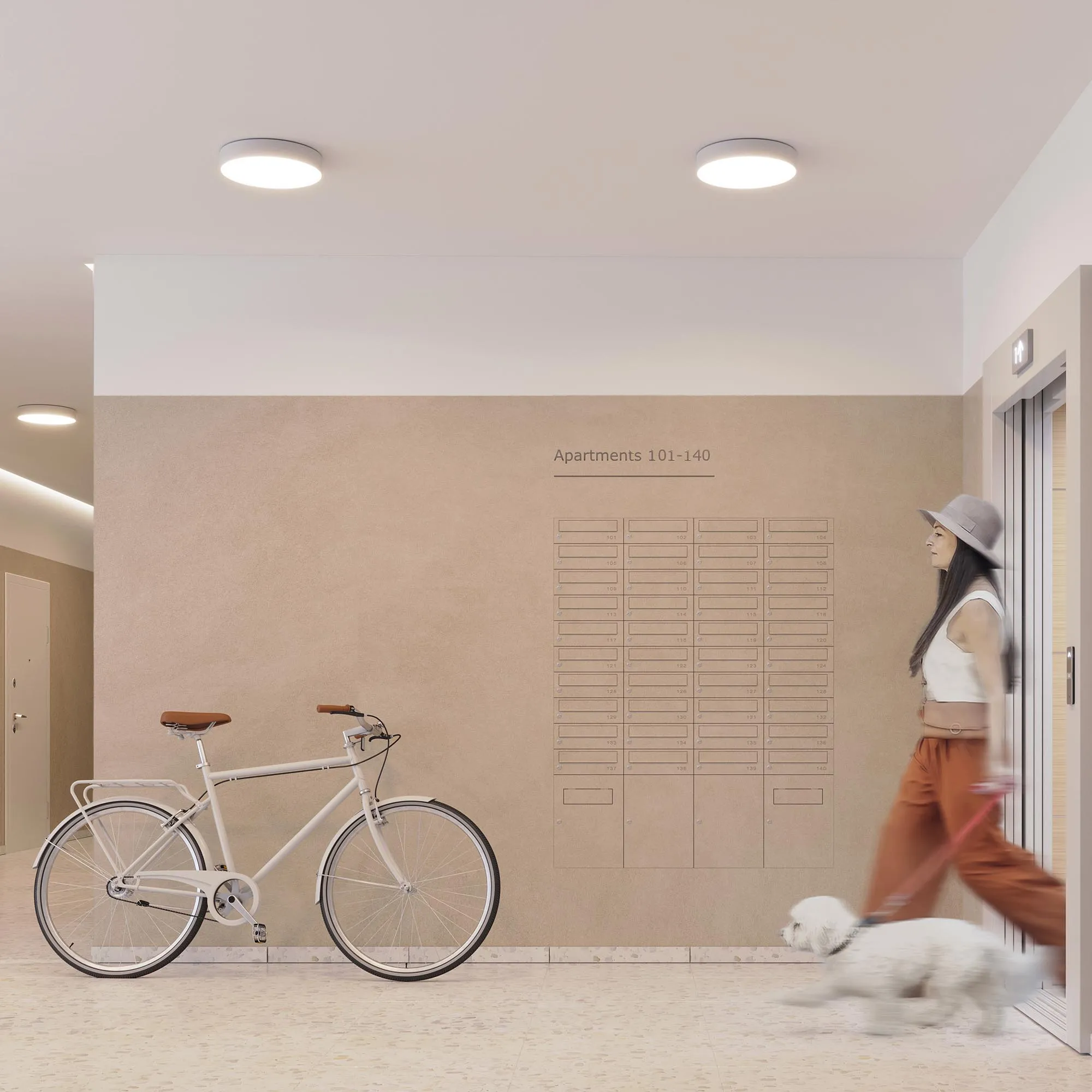 Светодиодный светильник с изменяемой мощностью. Мощность полная 10-15 Вт (переключается), св. поток 1375 лм, 105 лм/Вт, дневной 4000K, CRI>80, угол 110°, напряжение питания 230 В. Чёрный круглый корпус из пластика, экран PC, степень защиты IP54. Размер: длина 280 мм, ширина 280 мм, высота 68 мм. Монтаж накладной. Драйвер 48-83 В, 175/250 мА, пульсация <5%.