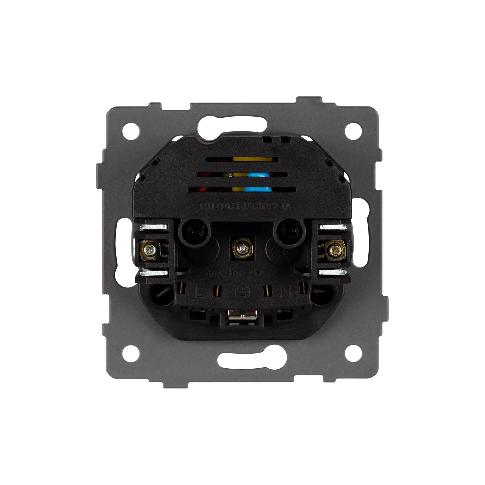 Механизм розетки с заземлением 1 пост 2 USB Type A+C порта. Цвет - серый. Без фронтальной рамки. Уровень пылевлагозащиты IP20. Устанавливается в стандартный подрозетник.