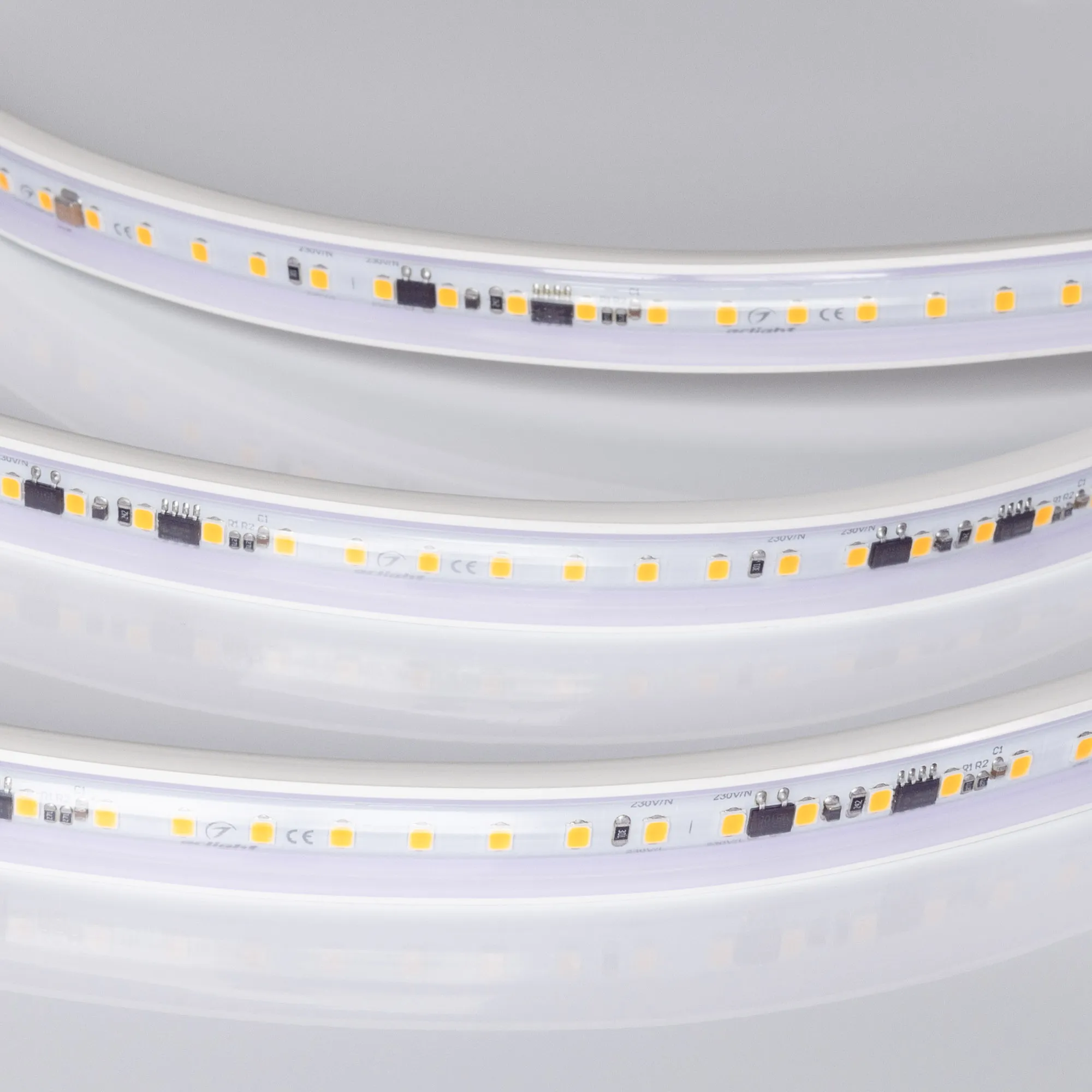 Светодиодная герметичная лента ARL серии A120, IP65 (PVC - трубка ПВХ экструзия). Светодиоды SMD 2835, 120 шт/м, белая плата шириной 12 мм, крепление на силиконовые скобы (скотч 3M отсутствует). Цвет ТЕПЛЫЙ 3000K, индекс цветопередачи CRI>85, угол 120°. Питание 230 В, мощность 15 Вт/м (450 Вт на 30 м). Размеры 3000x15x6.5 мм. Мин. отрезок 100 мм, 12 светодиодов. Цена за 1 м.